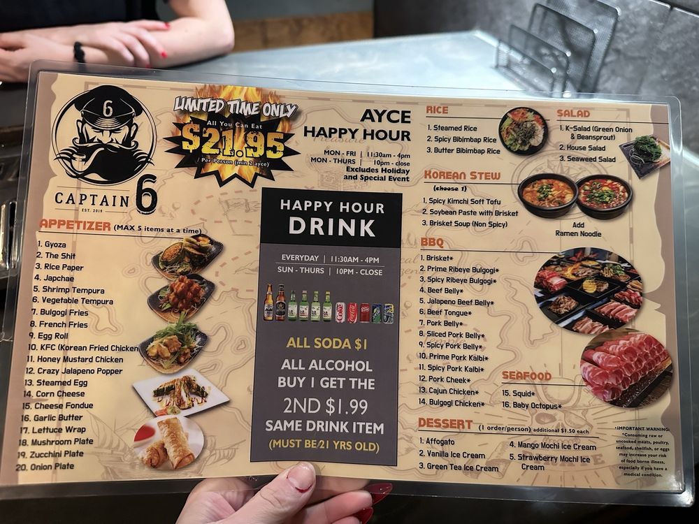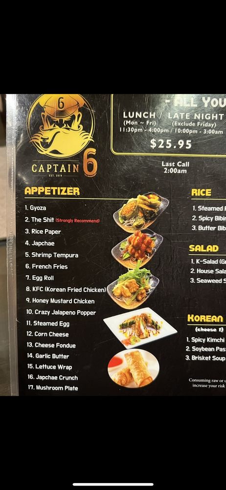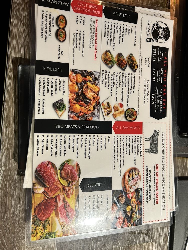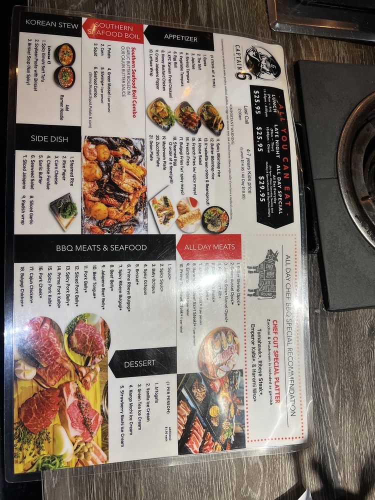 Captain6 Korean BBQ offers a wide range of options for seafood lovers, with items like shrimp, pink scallops, and lobster on the menu. Their small plates feature dishes like bulgogi fries and shrimp tacos, while side dishes include sashimi gazpacho and seafood pancake. Customers rave about the quality of the meat selection and the variety of soups available for grilling. The restaurant boasts a casual and friendly vibe with excellent service from staff like Lloyd, Earl, and Nathalia. With a focus on fresh meats and generous portion sizes, Captain6 delivers a solid Korean BBQ experience that keeps customers coming back for more. Whether you're looking for a great meal to share with friends and family or a satisfying BBQ session, Captain6 Korean BBQ is a must-visit spot in Las Vegas.